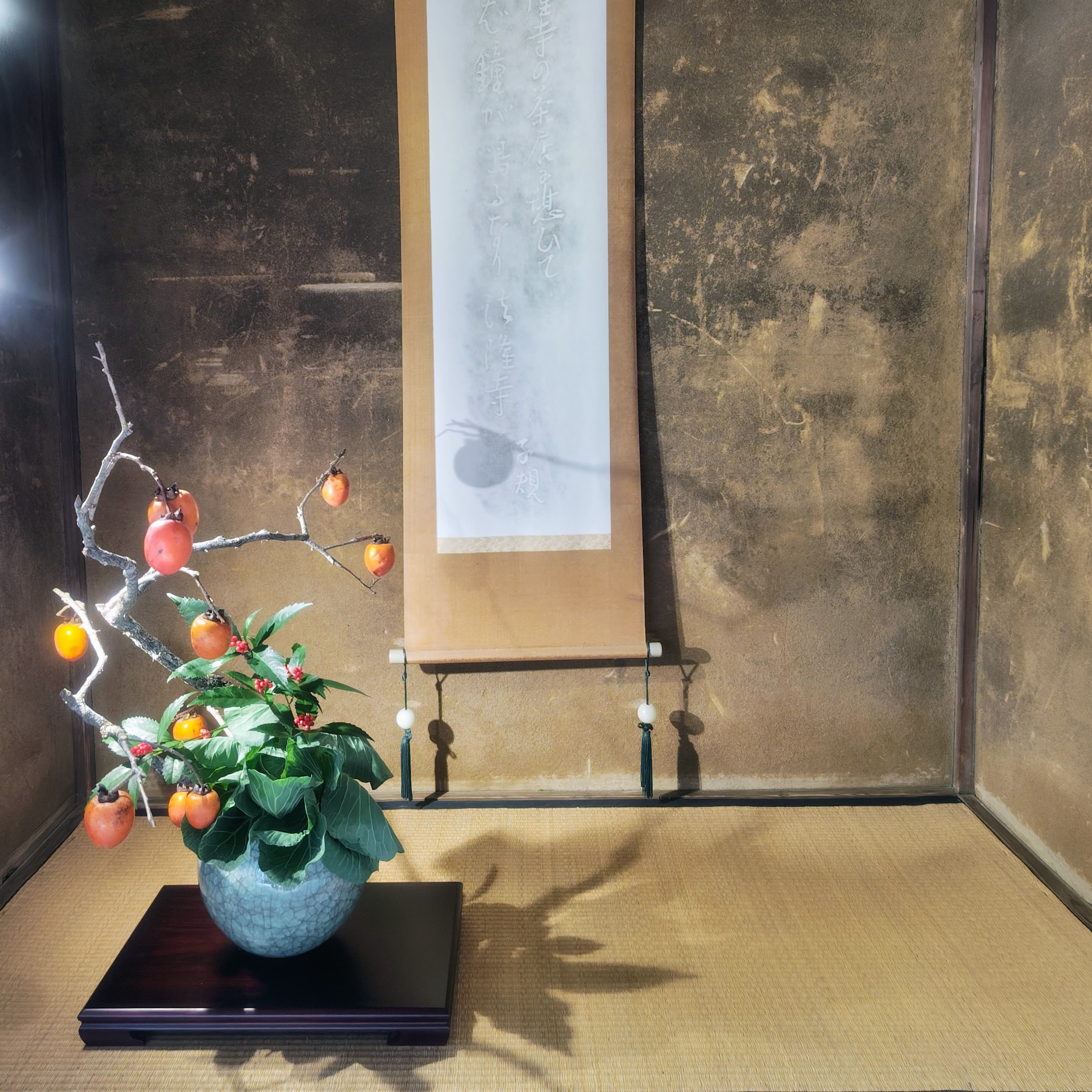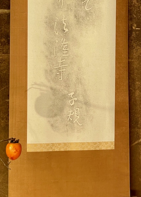 東京文化財ウィーク企画事業「子規庵で花を活ける」第5組の展示が今日から始まりました。 出品は、小原流 畔蒜博葉先生、木村理沙氏、大川真喜子氏の3名です。 色鮮やかなお花が明るい子規庵を演出しています。なかなか珍しいお花の取り合わせの作品や、お花だけでなくスポットライトによる襖に映る水墨画のような影も絶品なので、観る角度を変えながらお楽しみください。 床の間の枝柿を活けた作品の後ろにある掛け軸、法隆寺の「柿食へば」の句碑拓本に枝柿の影が映っていました。筆柿の影が何故か丸い柿なのが謎ですが、意図していなかったサプライズに出品者からも「子規さんの演出でしょうか」の感想が。 本作品は24日(月・振休)迄展示中です。三連休にどうぞお出かけください。