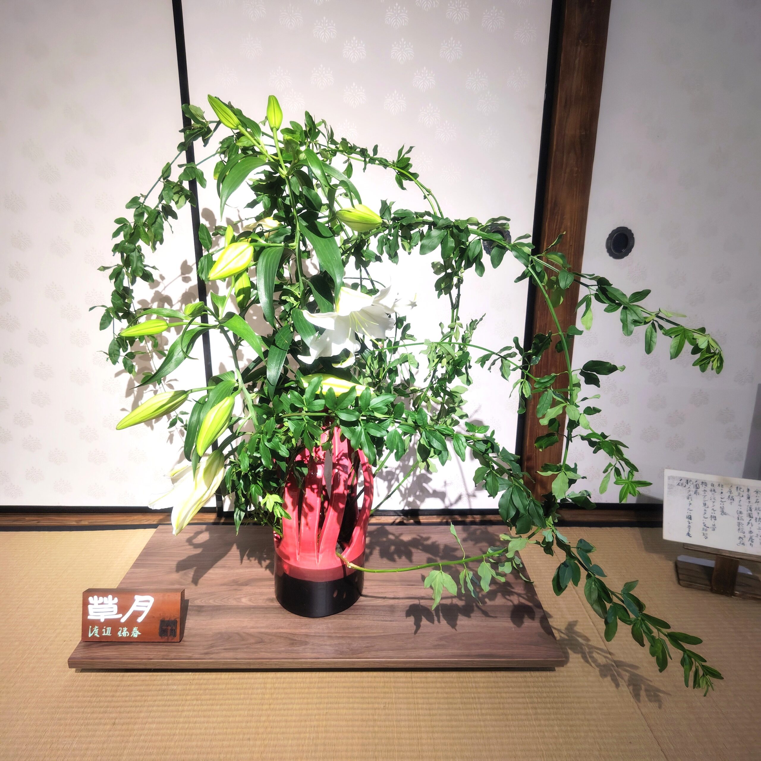 昨日27日から東京文化財ウィーク2025企画事業「子規庵で花を活ける」最終の第6組の展示が始まりました。 今週の展示は草月流 渡辺社中 渡辺瑞春先生、高森千雀氏、浦田瑞栄氏の3名による作品です。 先週までとはまた全く違う世界が子規庵で表現されました。 病間六帖の華やかな景色と空中展示を子規も楽しんでいると思います。 30日までの展示となりますので、お見逃しなく。