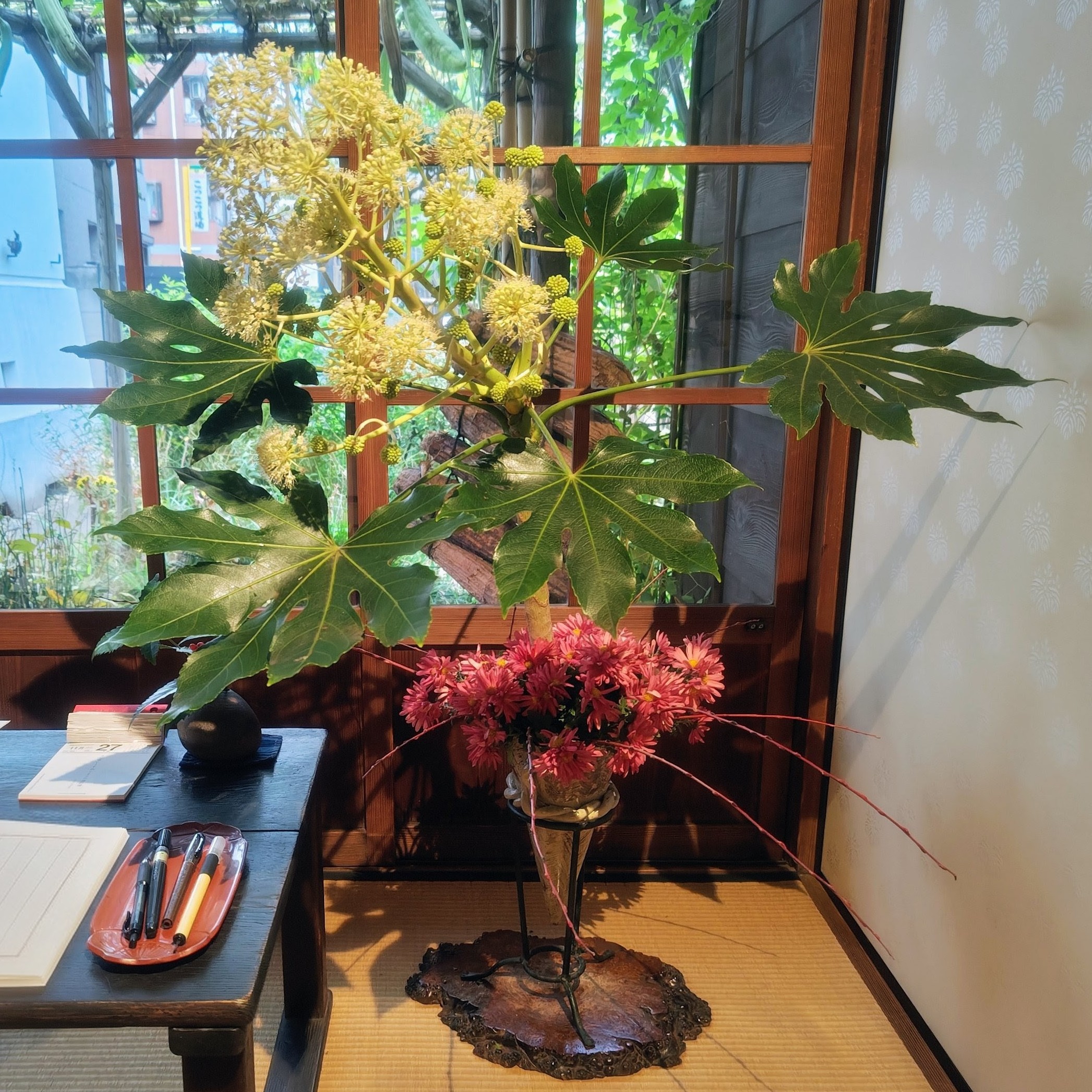 本日から東京文化財ウィーク2025子規庵企画事業「子規庵で花を活ける」が始まりました。 第1組は 國風華道会 龍前行雲氏の作品です。 子規庵小園は遅れて咲いた花により夏の名残がありましたが、作品が出来上がるとすっかり秋の景色を感じました。 いつもと違う子規庵の表情をお楽しみください。