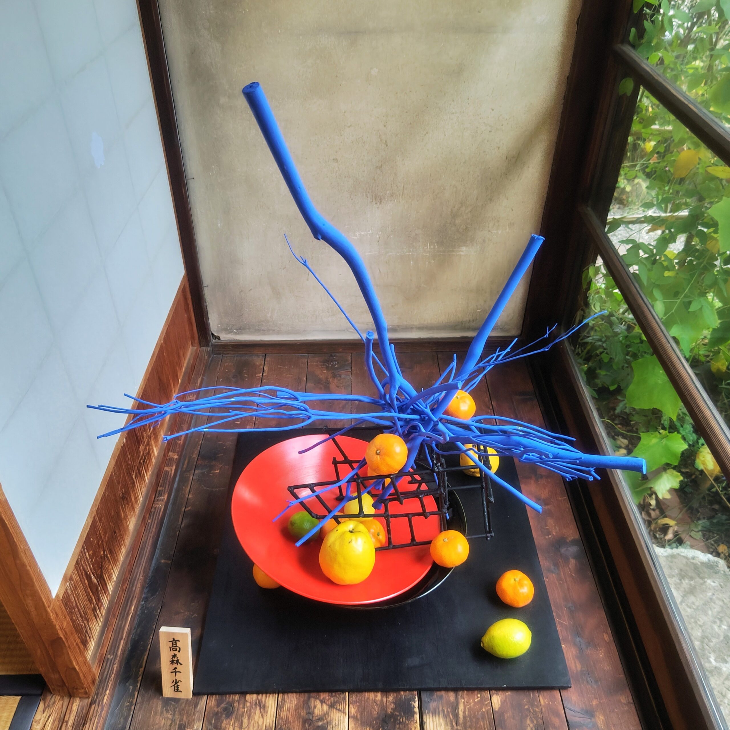 「子規庵で花を活ける」第4組は林有為子先生が率いる林社中の皆さんです。 林有為子先生、村井千代子先生、樋口裕子先生、土屋弘子先生、塩川陽子先生による大作が六帖間に出現、来庵者から思わず「凄い」との一言が。 床の間には青と綺羅に彩色された糸瓜と大きな柿の作品、八帖間には一転可愛らしい菊の活け花を黄色い銀杏の葉、昨年に続き、林ワールドが子規庵を彩っています。 第4組の展示は16日(日)迄です。どうぞご来庵ください
