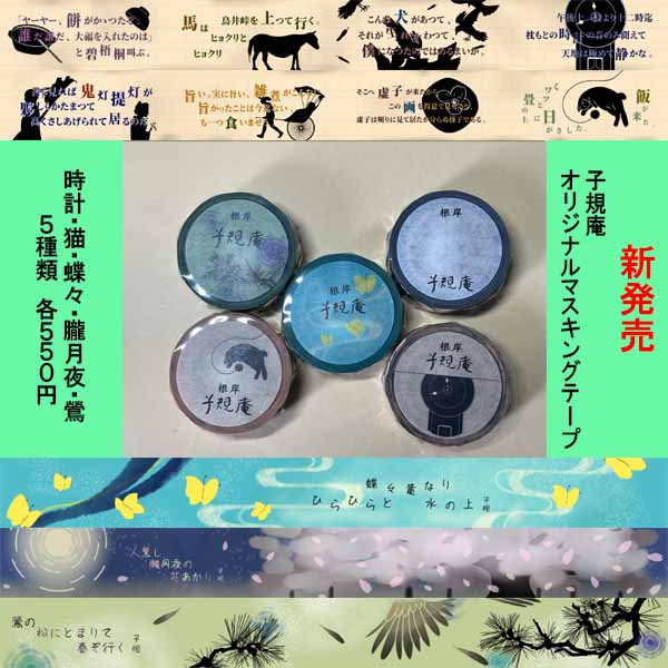 3月から子規庵のオリジナルグッズに新商品が加わりました。 デザインをしたのは子規庵文化ボランティアの高校生で、子規の俳句や文章からのインスピレーションで描かれたデザインです。 オリジナルマスキングテープ 5種 各550円で販売しています。 子規庵にお出かけの際にはぜひお求めください。 |